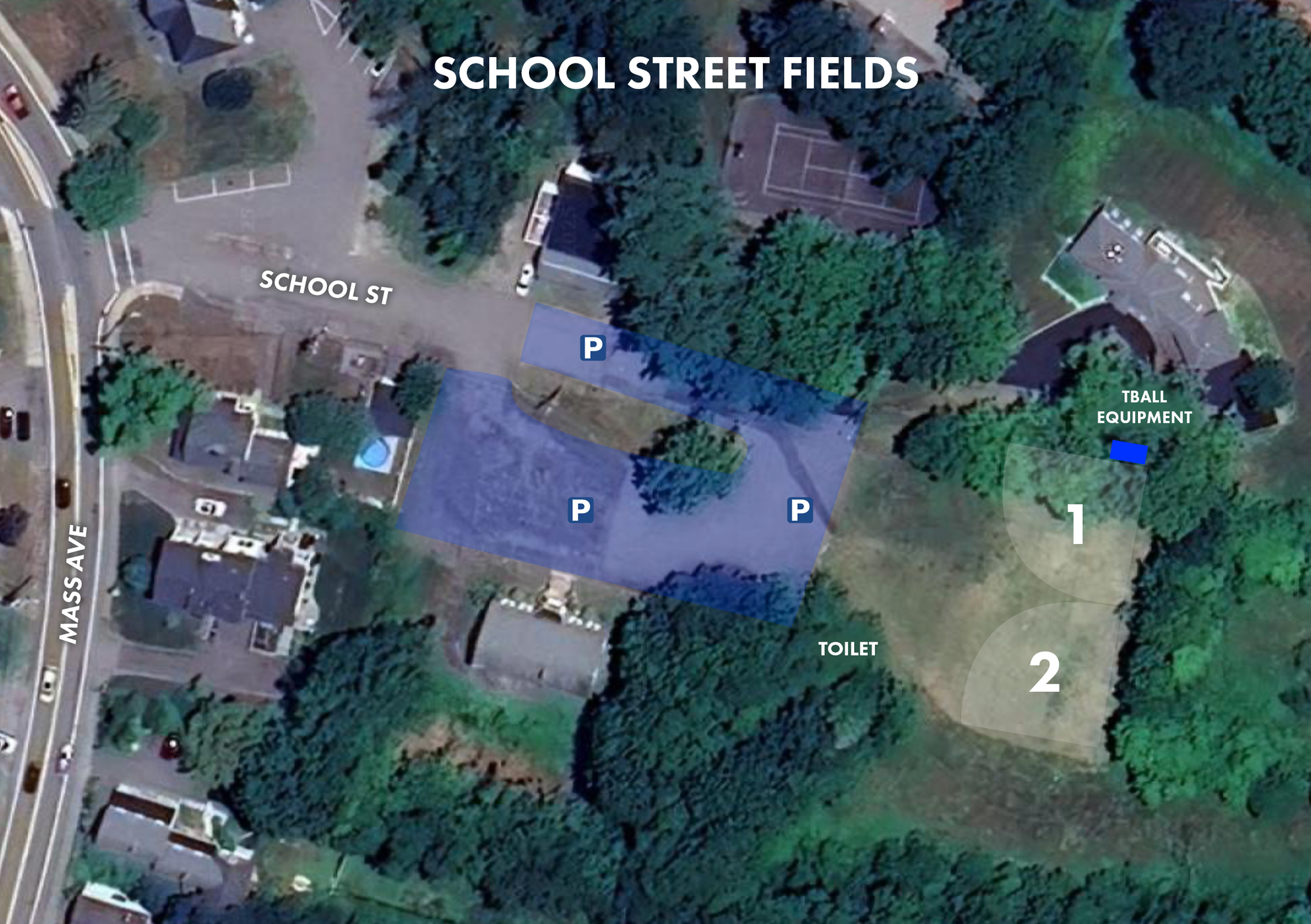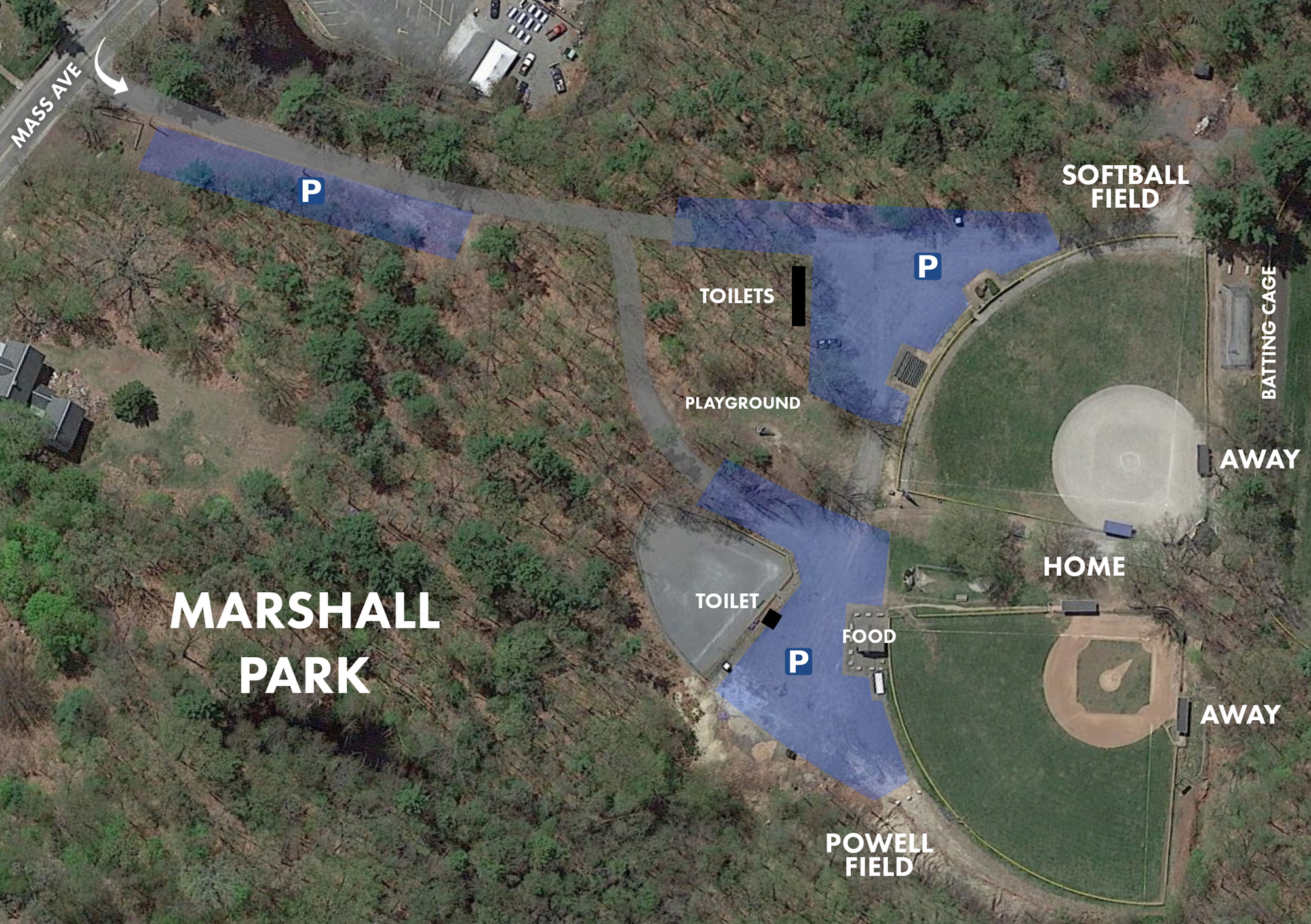 - There is an upper and lower parking lot outside the outfield of each field. Additional parking can be found along the entrance from Mass Ave.